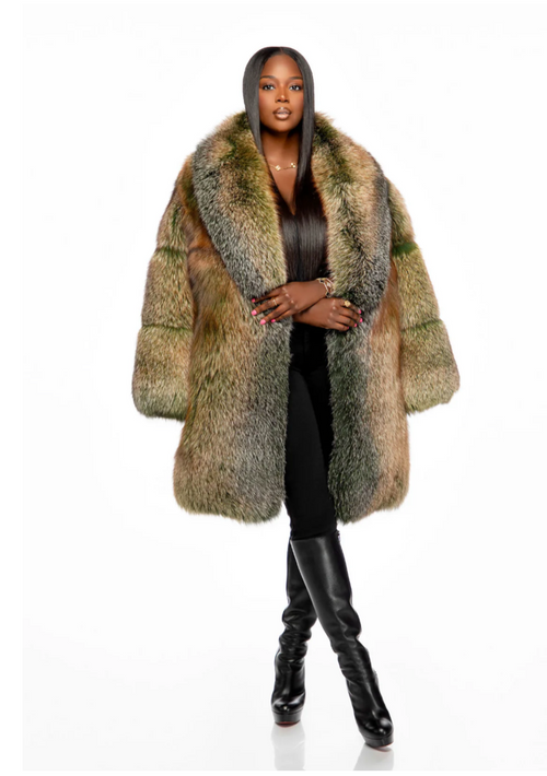 Stay warm, cute, and classy in our Trinity cropped golden island fur. It features two pockets and hook closure.